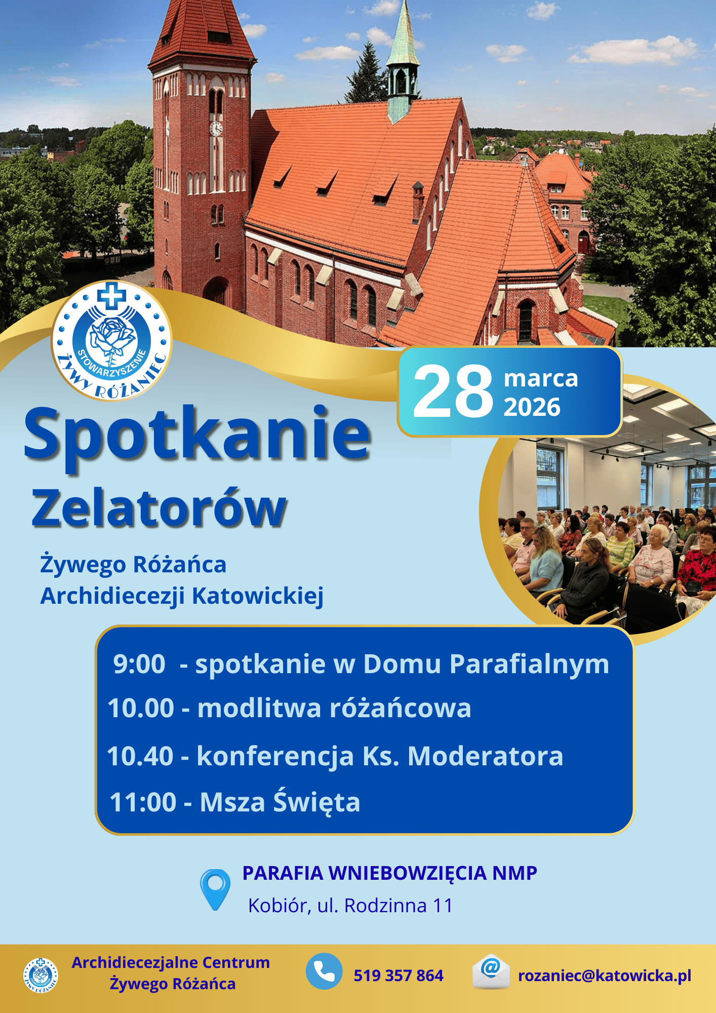 - W sobotę 28 marca w Parafii Wniebowzięcia NMP w Kobiórze odbędzie się jubileuszowe Forum Zelatorów Żywego Różańca. Program zamieszczono na plakacie: Forum Zelatorów